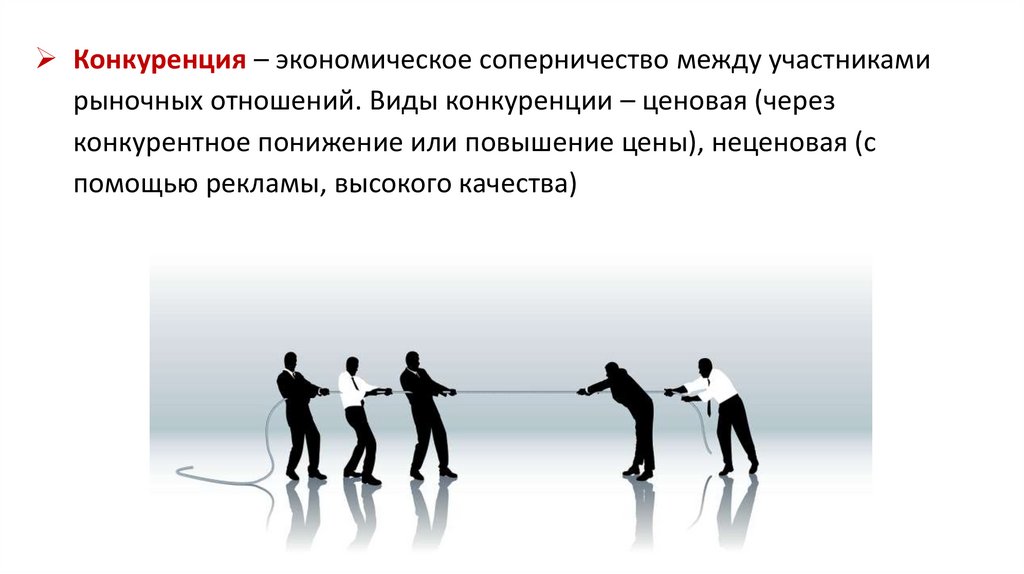 Конкуренция – экономическое соперничество между участникамирыночных отношений. Виды конкуренции – ценовая (через