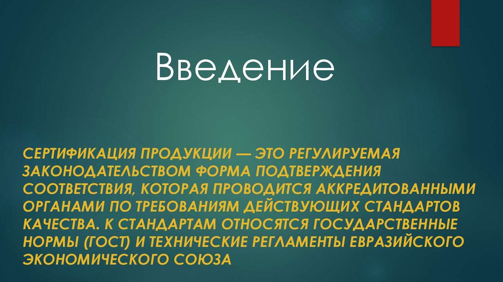 ВведениеСЕРТИФИКАЦИЯ ПРОДУКЦИИ — ЭТО РЕГУЛИРУЕМАЯ