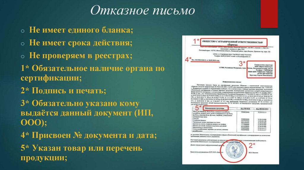 сертификат или отказное письмо, в случае, если указанная в документе