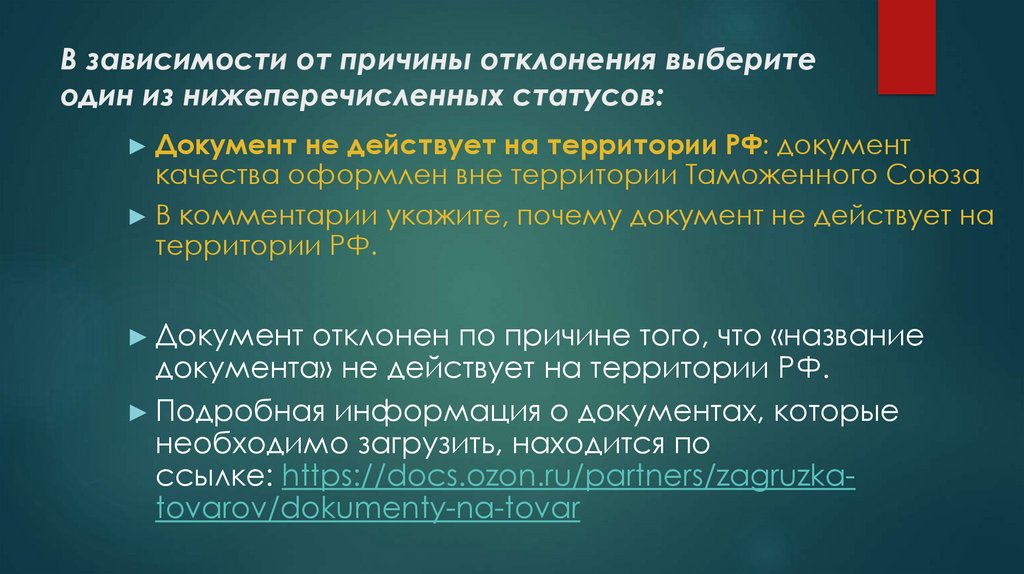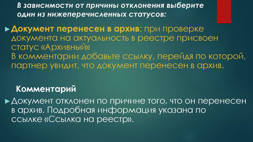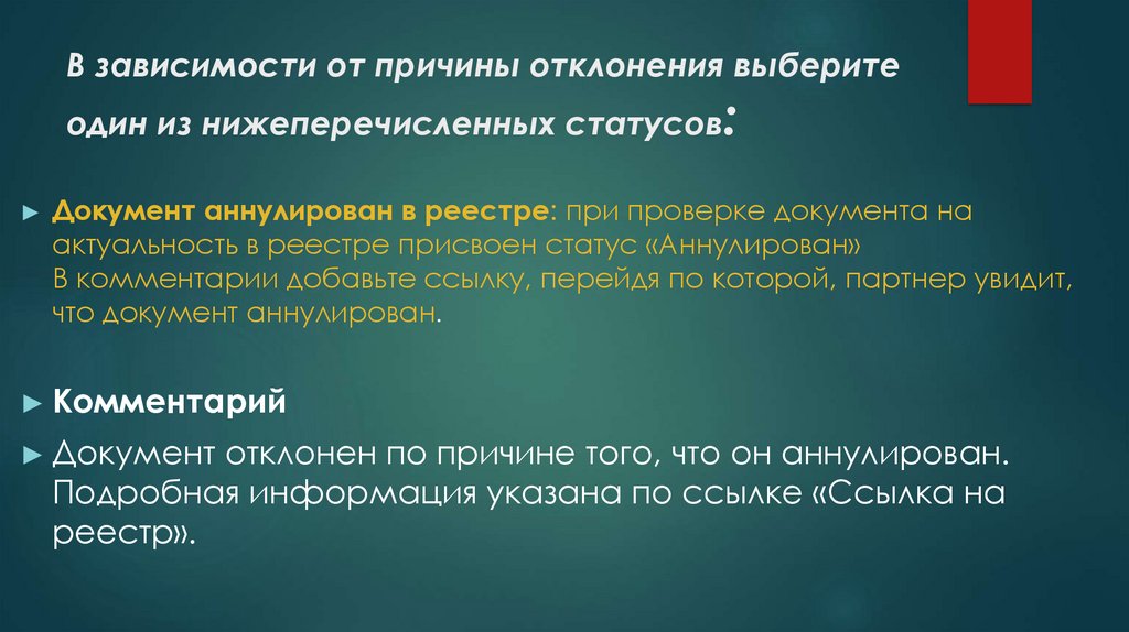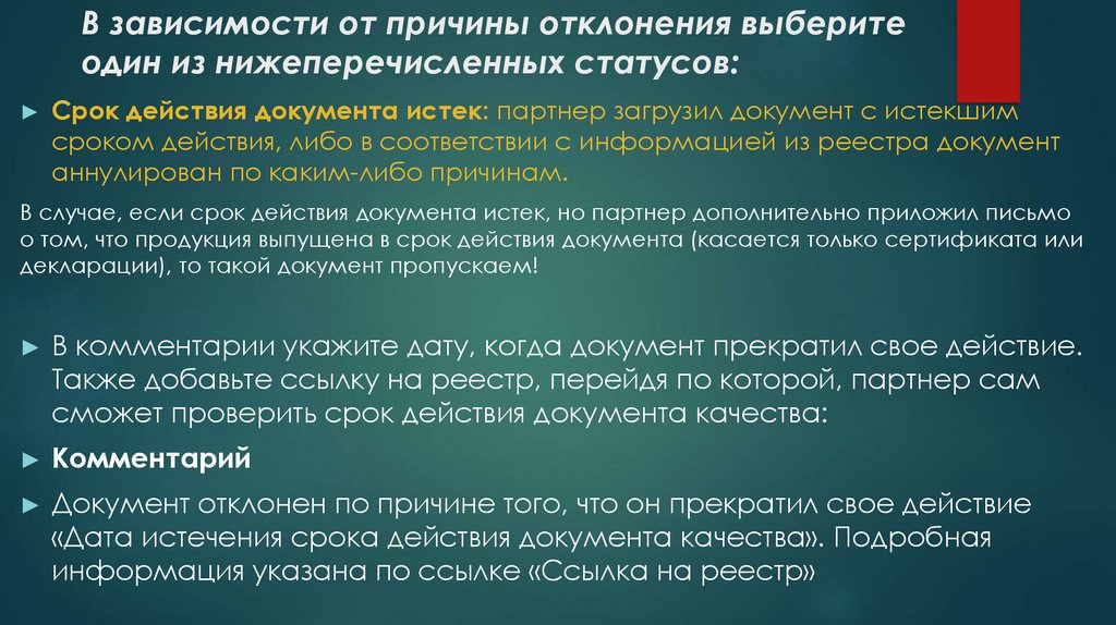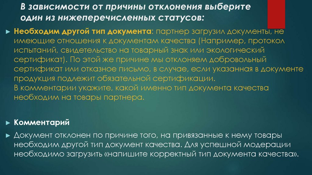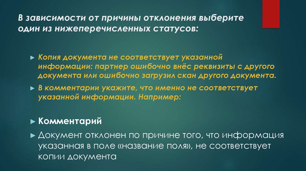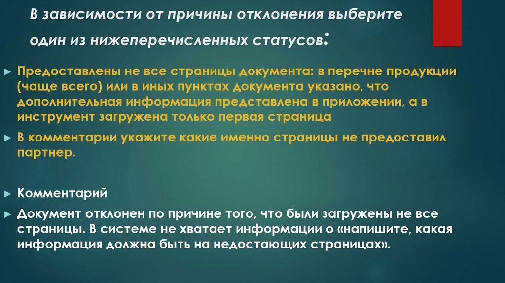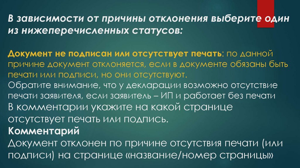 В зависимости от причины отклонения выберите одиниз нижеперечисленных статусов: