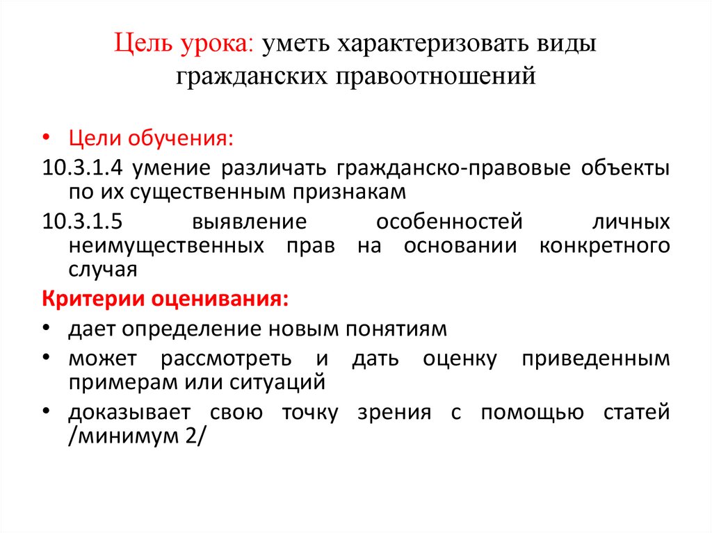 Цель урока: уметь характеризовать видыгражданских правоотношений