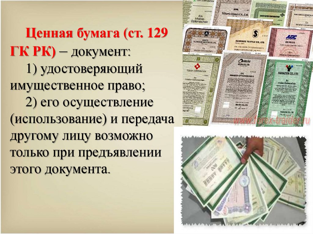 Ценная бумага (ст. 129ГК РК) – документ: