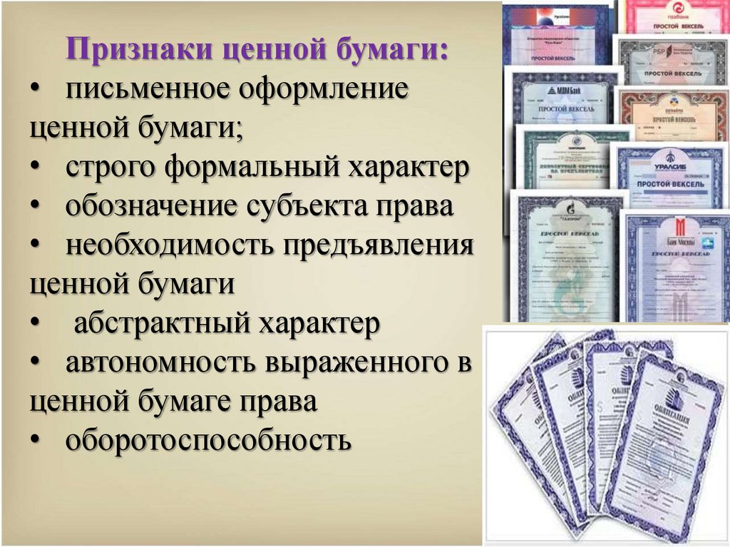 Признаки ценной бумаги:• письменное оформление