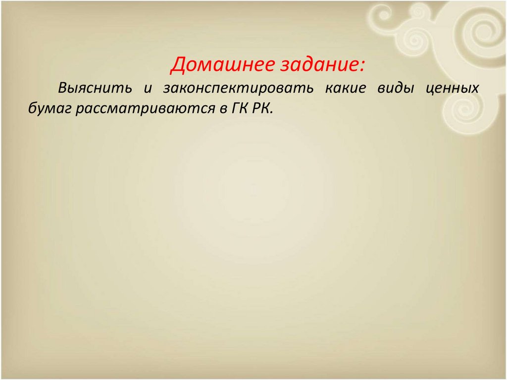 Домашнее задание:Выяснить и законспектировать какие виды ценных