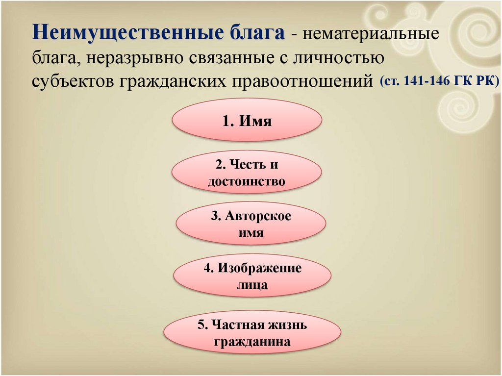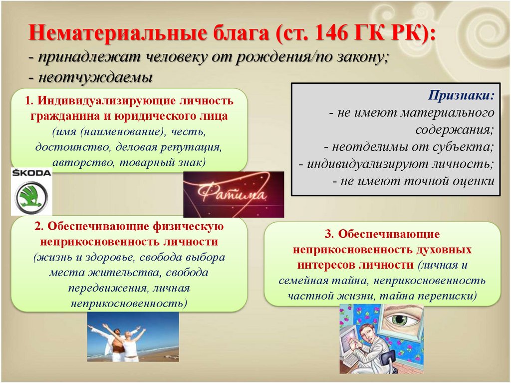 Нематериальные блага (ст. 146 ГК РК):- принадлежат человеку от рождения/по закону;