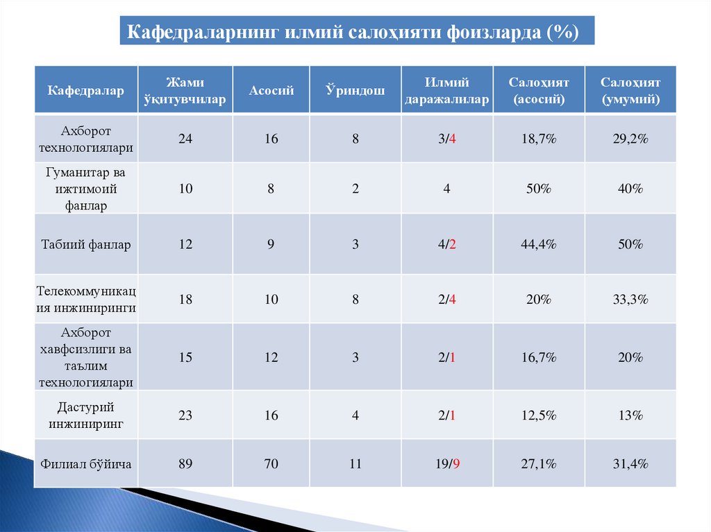 Кафедраларнинг илмий салоҳияти фоизларда (%)Кафедралар