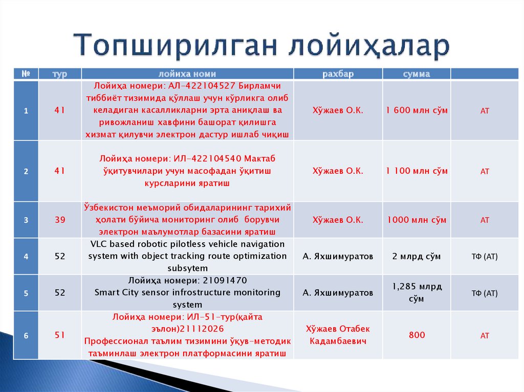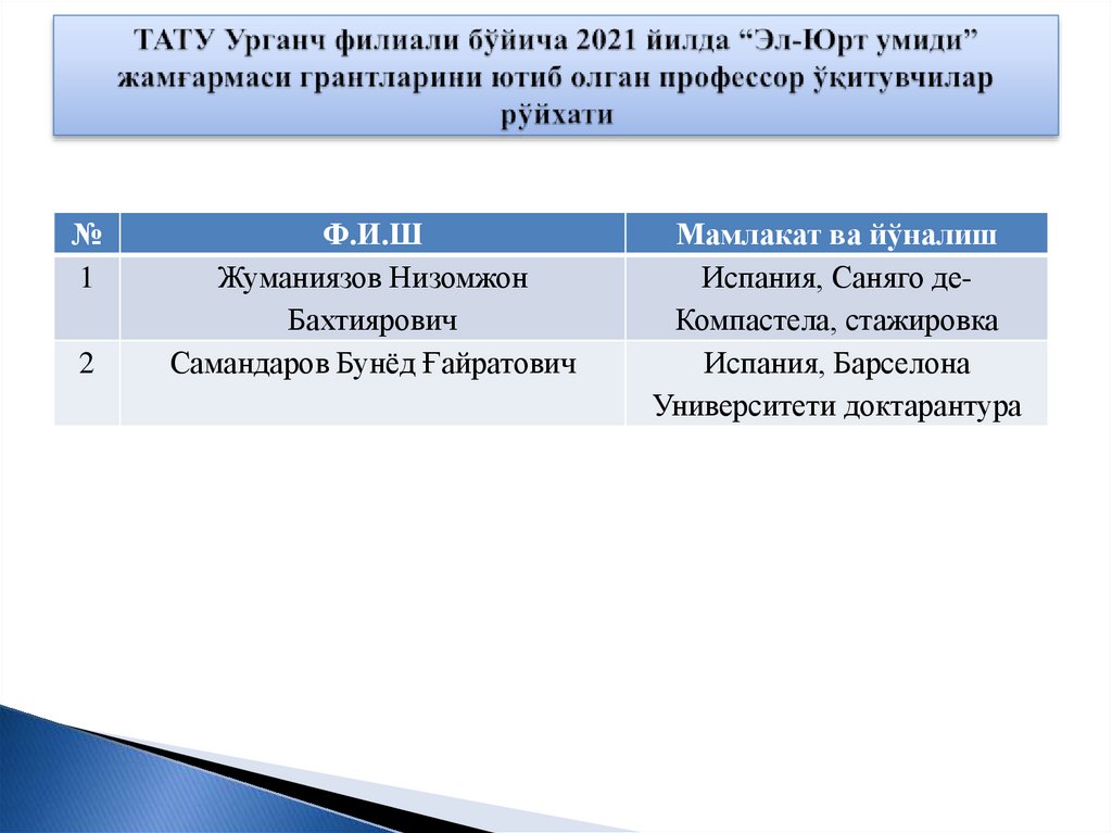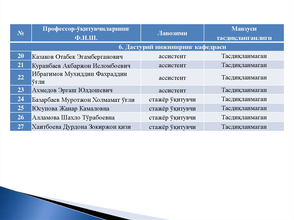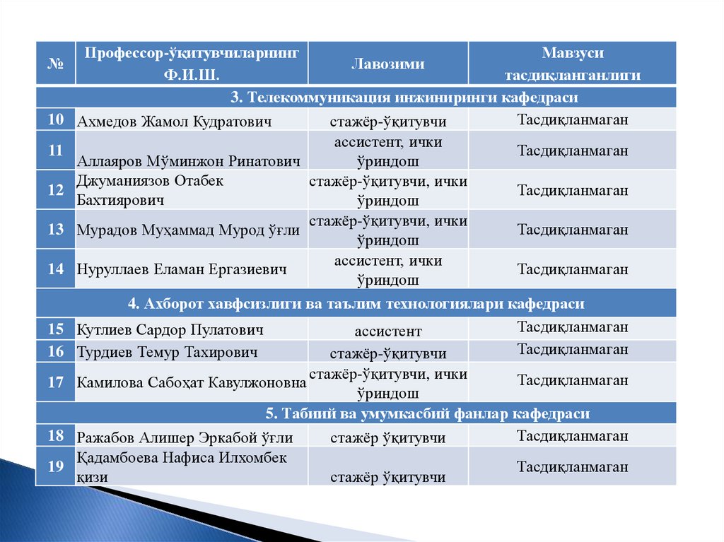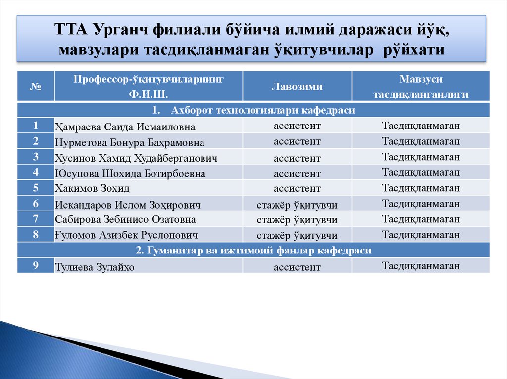 ТТА Урганч филиали бўйича илмий даражаси йўқ,мавзулари тасдиқланмаган ўқитувчилар рўйхати