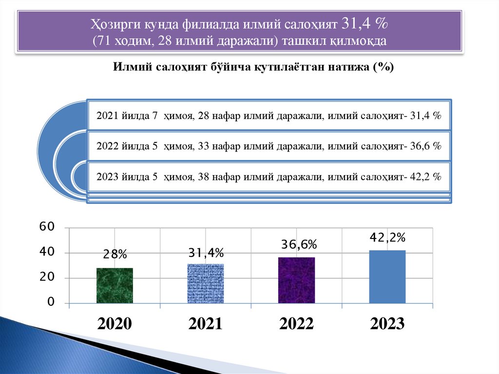 Ҳозирги кунда филиалда илмий салоҳият 31,4 %(71 ходим, 28 илмий даражали) ташкил қилмоқда