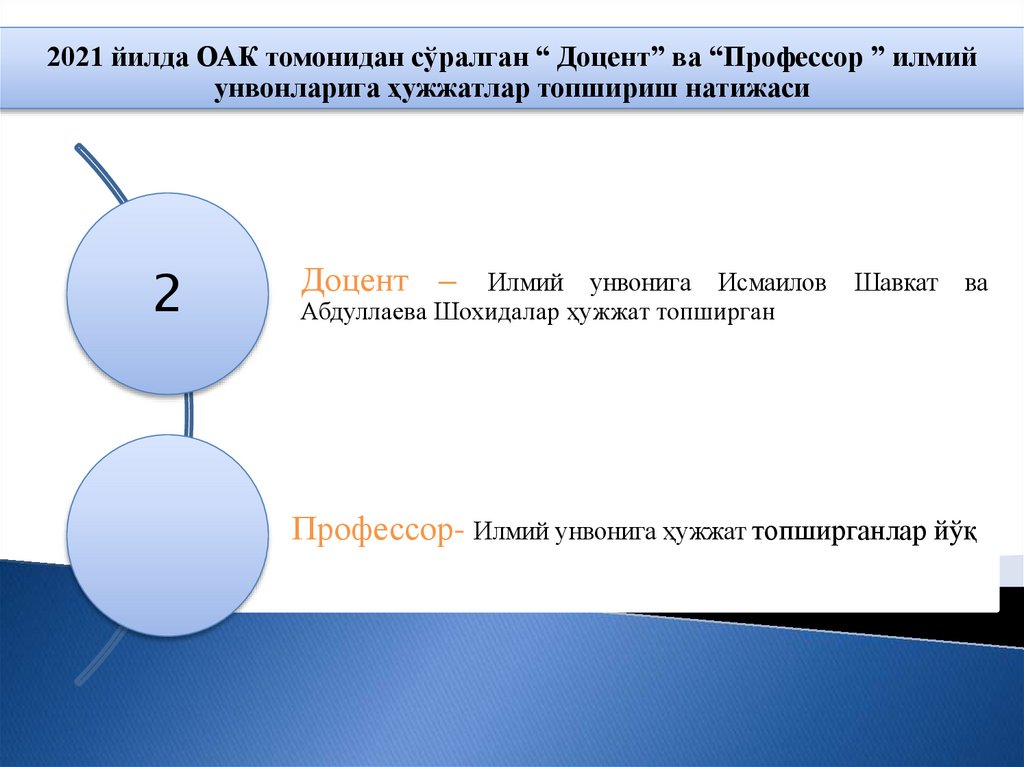2021 йилда ОАК томонидан сўралган “ Доцент” ва “Профессор ” илмийунвонларига ҳужжатлар топшириш натижаси