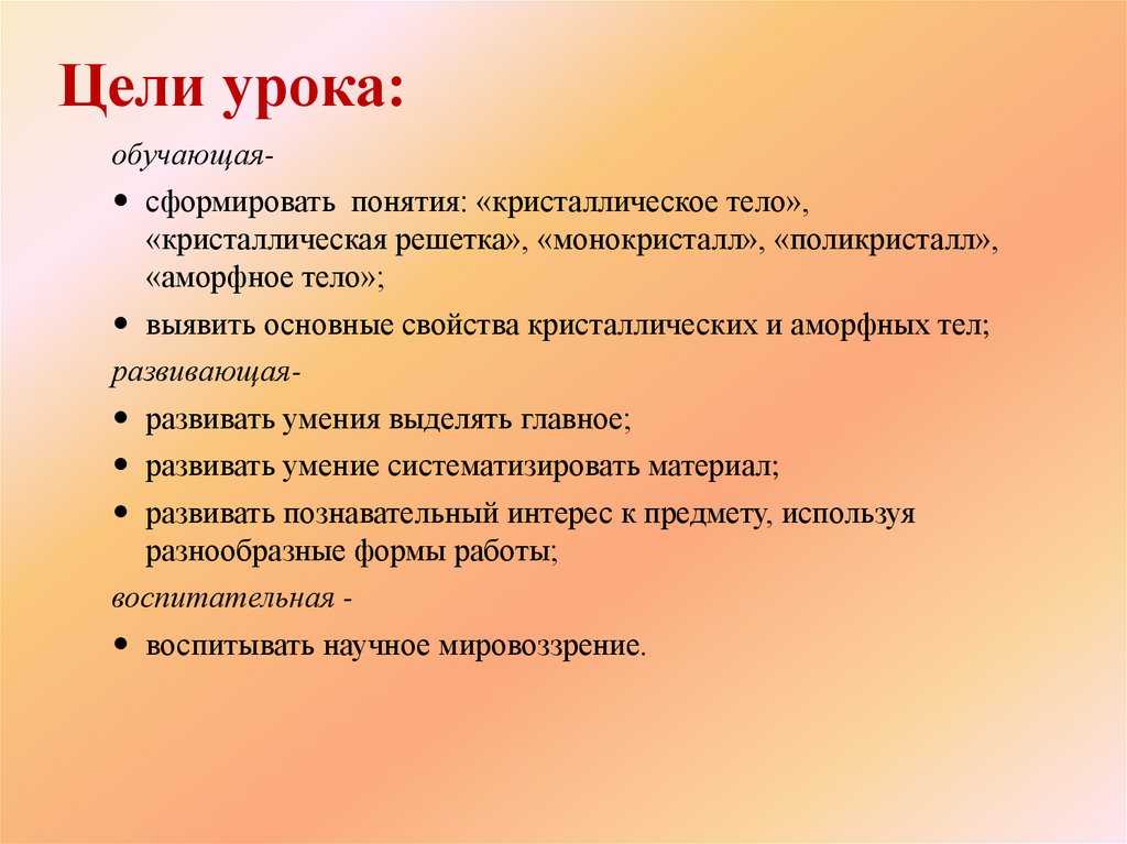 Цели урока:обучающая сформировать понятия: «кристаллическое тело»,