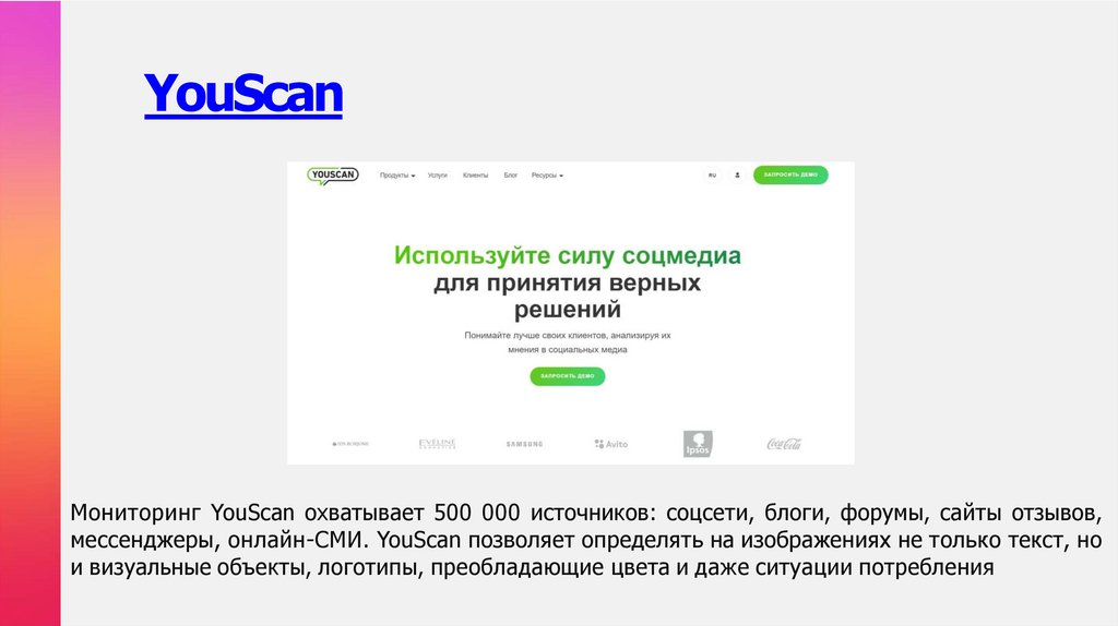 YouScanМониторинг YouScan охватывает 500 000 источников: соцсети, блоги, форумы, сайты отзывов,