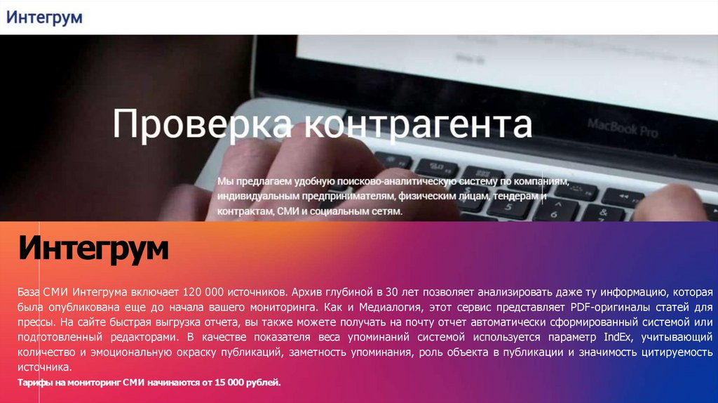 ИнтегрумБаза С М И Интегрума включает 120 000 источников. Архив глубиной в 30 лет позволяет анализировать даже ту информацию, которая
