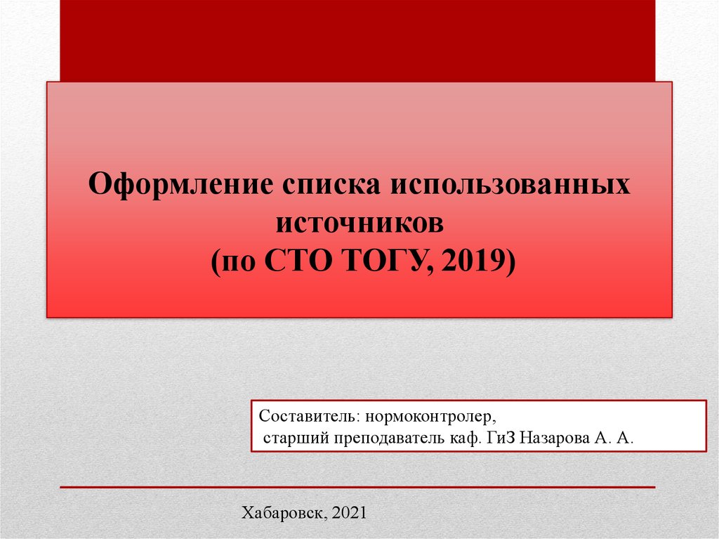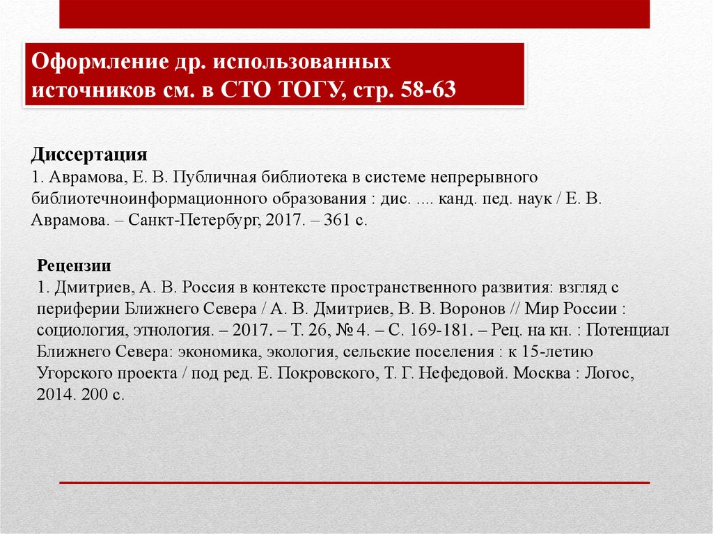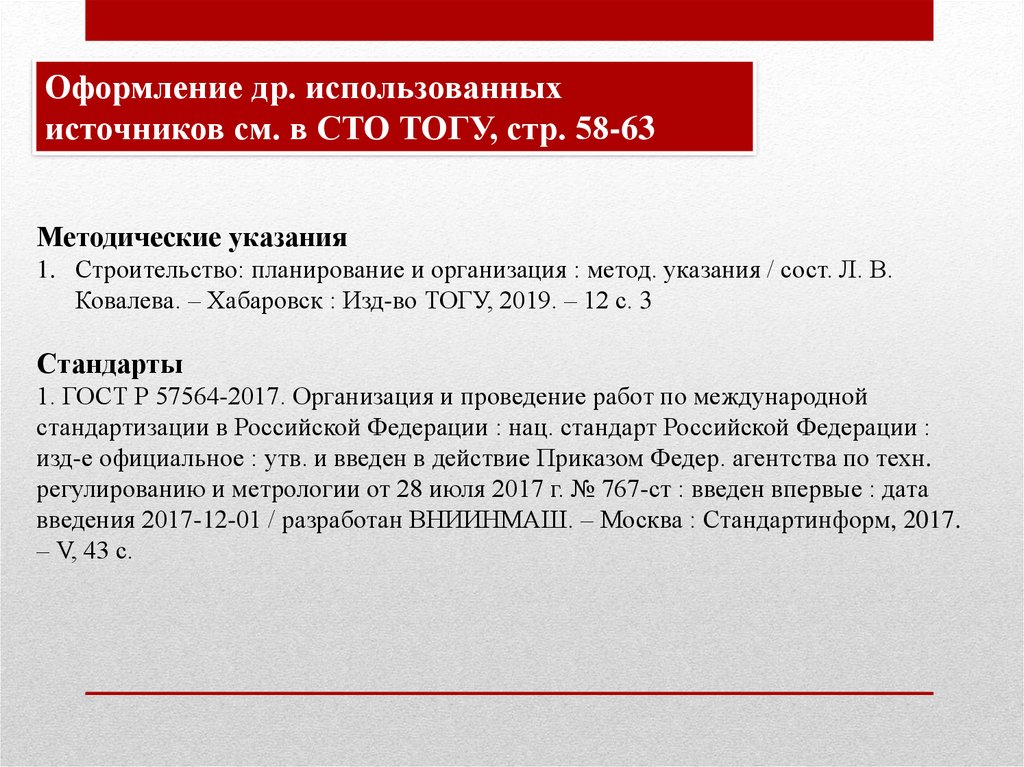 Оформление др. использованныхисточников см. в СТО ТОГУ, стр. 58-63