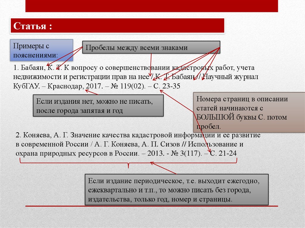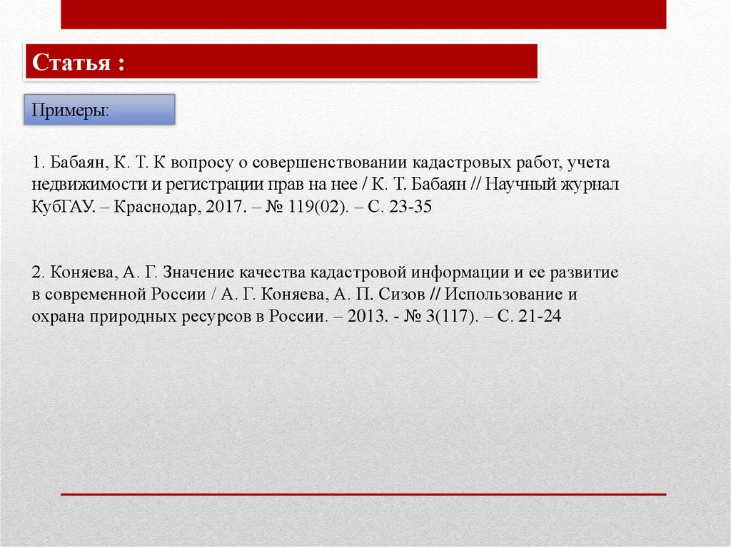 1. Бабаян, К. Т. К вопросу о совершенствовании кадастровых работ, учета