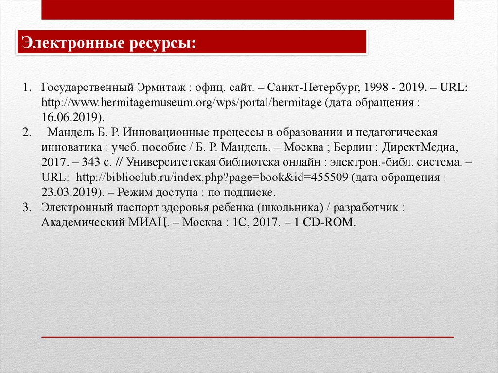 Электронные ресурсы:1. Государственный Эрмитаж : офиц. сайт. – Cанкт-Петербург, 1998 - 2019. – URL: