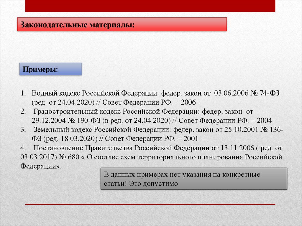 Законодательные материалы:Примеры: