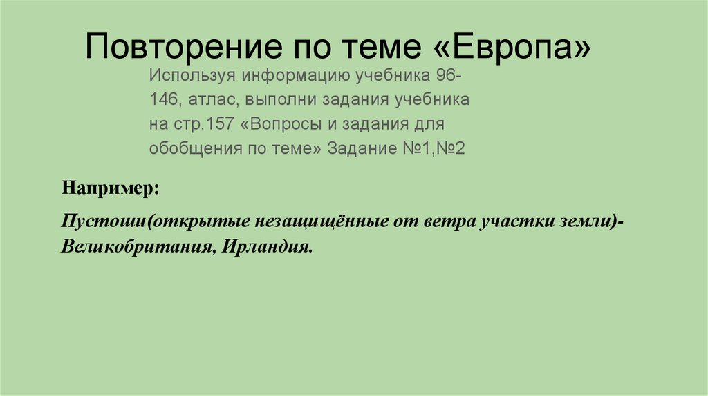 Повторение по теме «Европа»Используя информацию учебника 96146, атлас, выполни задания учебника