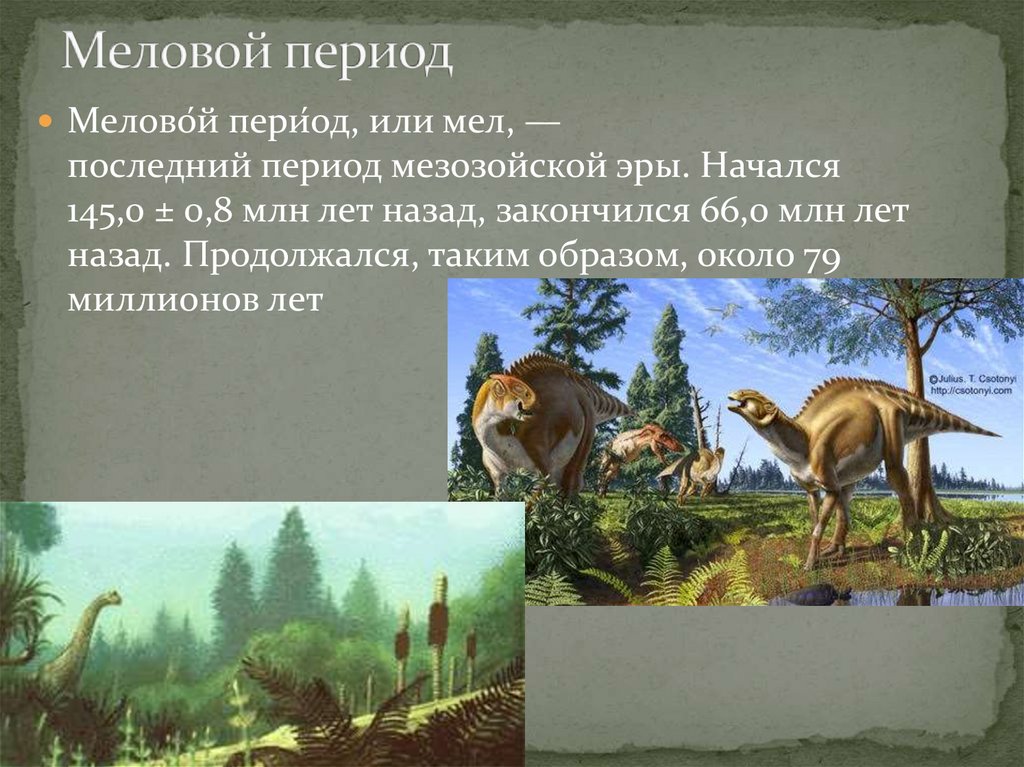 Мелово́й пери́од, или мел, —последний период мезозойской эры. Начался