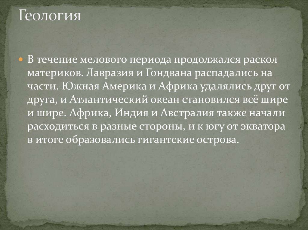 В течение мелового периода продолжался расколматериков. Лавразия и Гондвана распадались на