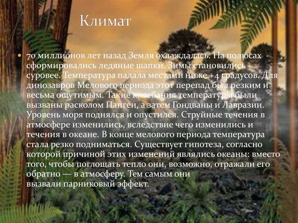 70 миллионов лет назад Земля охлаждалась. На полюсахсформировались ледяные шапки. Зимы становились