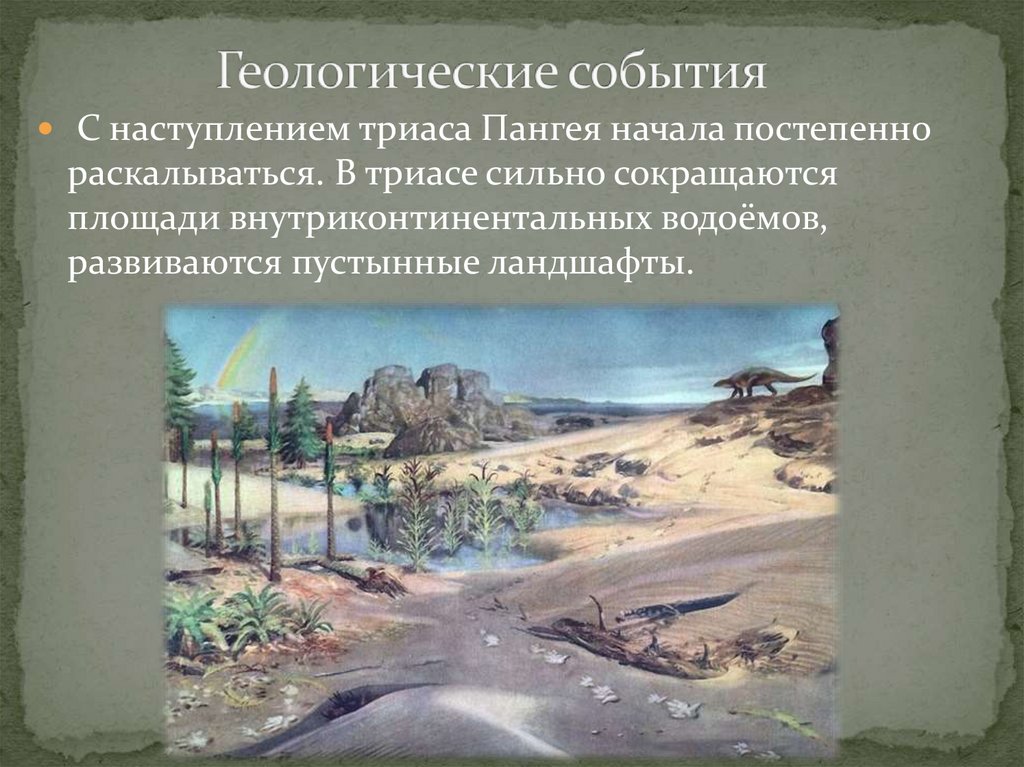 С наступлением триаса Пангея начала постепеннораскалываться. В триасе сильно сокращаются