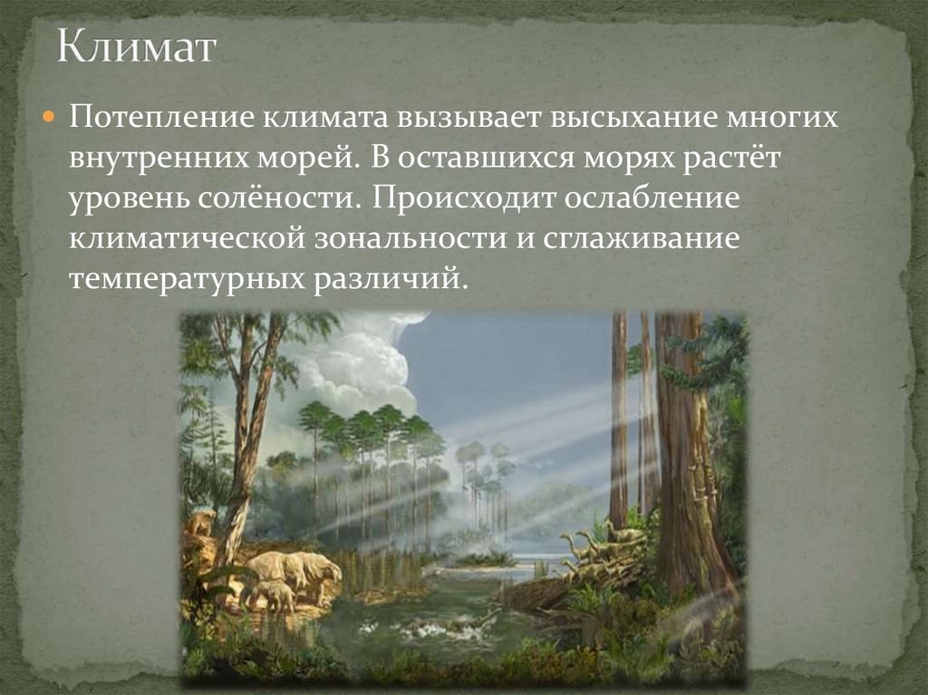 Потепление климата вызывает высыхание многихвнутренних морей. В оставшихся морях растёт