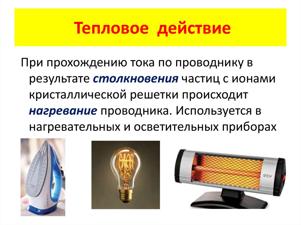 Тепловое действиеПри прохождению тока по проводнику в