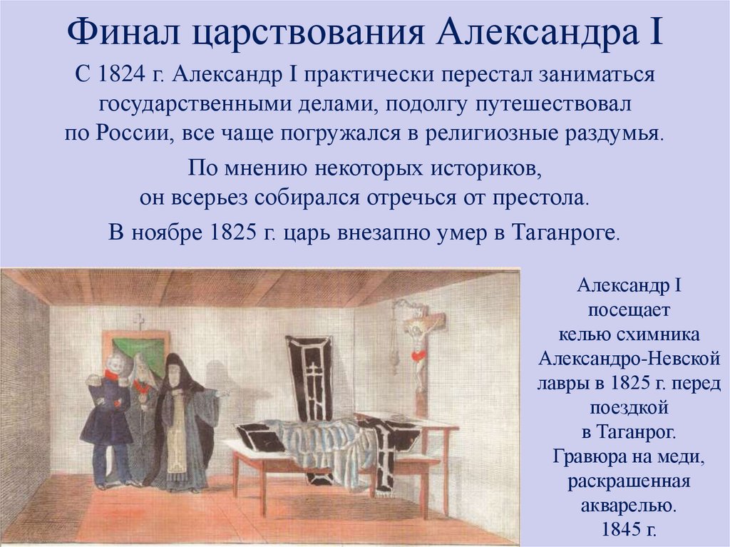 Финал царствования Александра IС 1824 г. Александр I практически перестал заниматься
