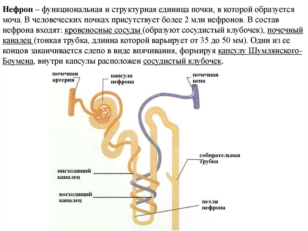 Нефрон – функциональная и структурная единица почки, в которой образуетсямоча. В человеческих почках присутствует более 2 млн нефронов. В состав