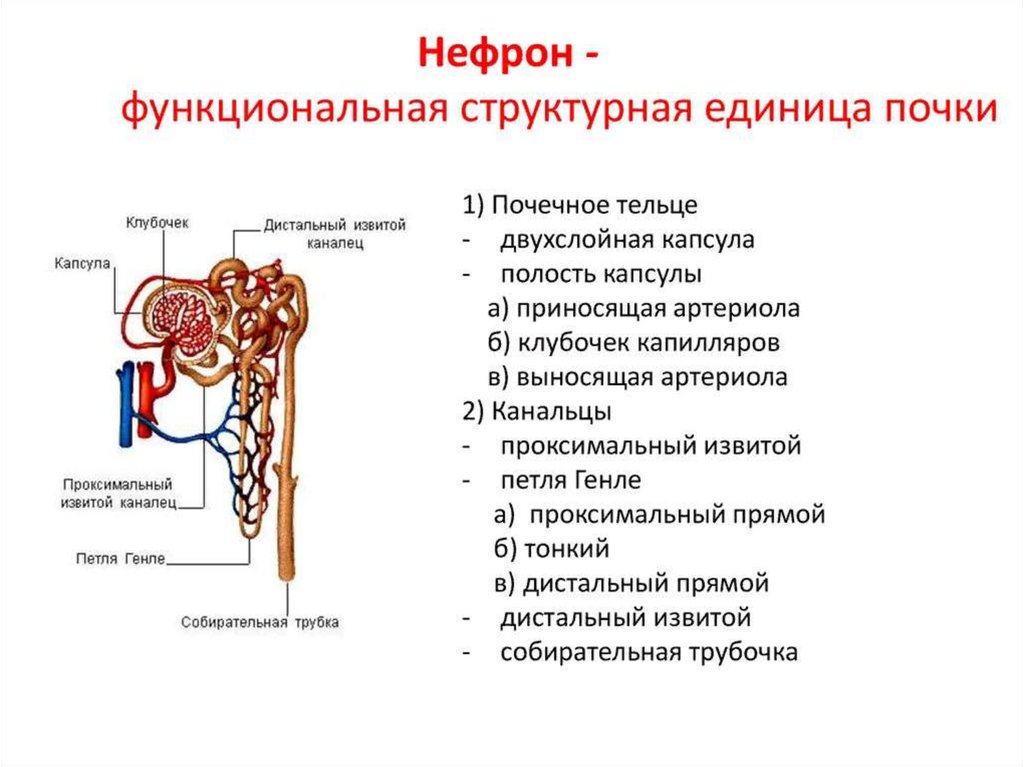 нефрона входят: кровеносные сосуды (образуют сосудистый клубочек), почечный