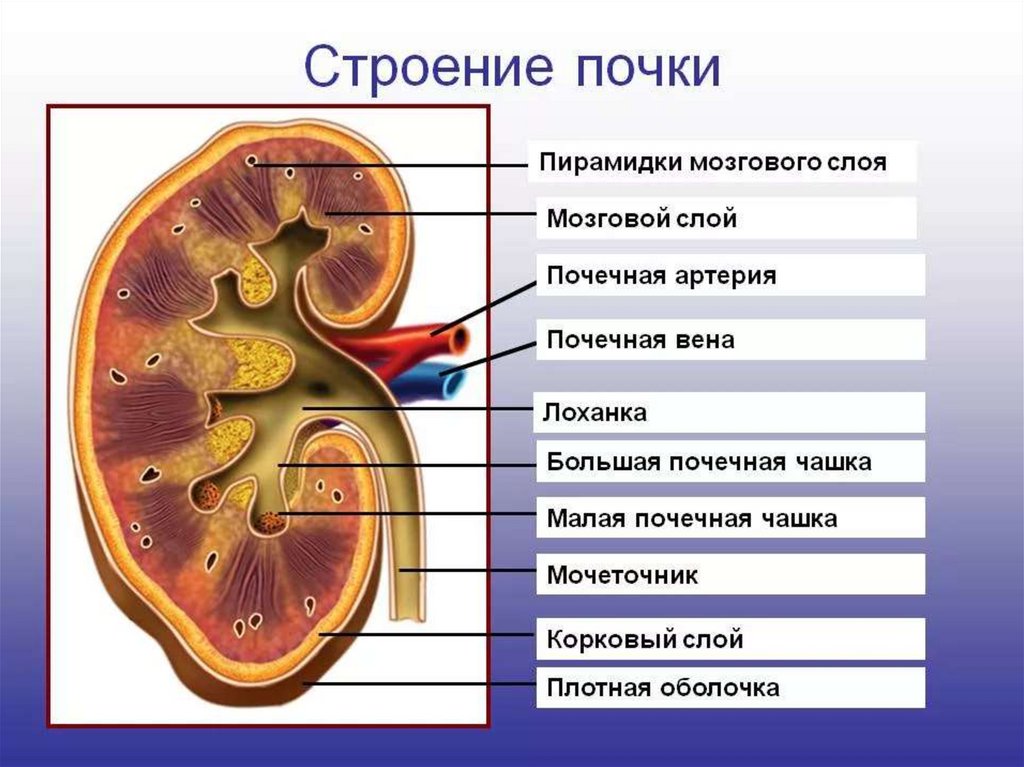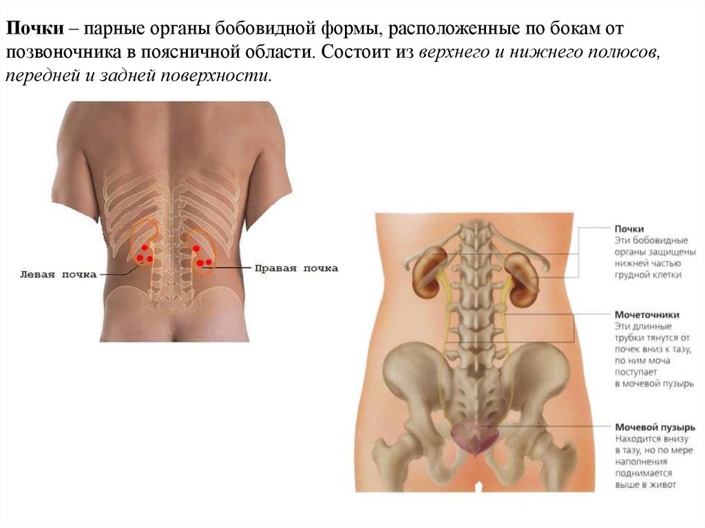 Почки – парные органы бобовидной формы, расположенные по бокам отпозвоночника в поясничной области. Состоит из верхнего и нижнего полюсов,