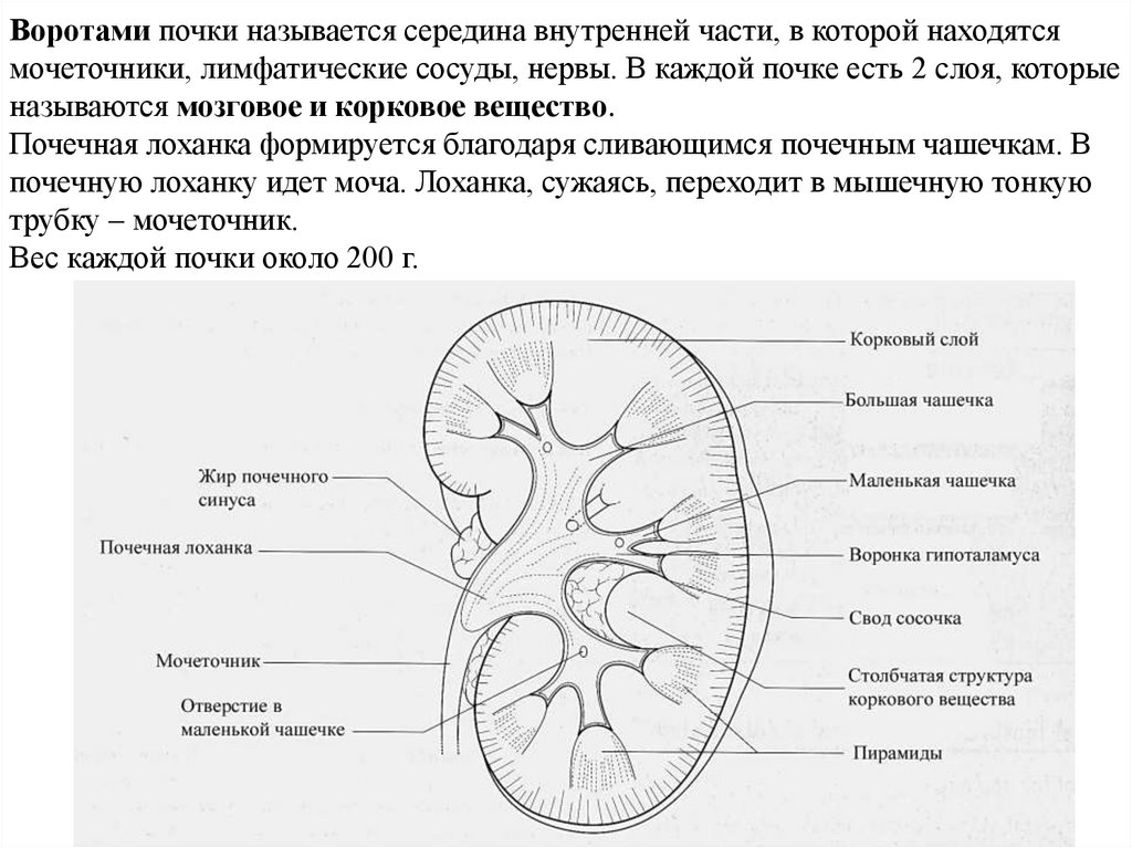 Воротами почки называется середина внутренней части, в которой находятсямочеточники, лимфатические сосуды, нервы. В каждой почке есть 2 слоя, которые