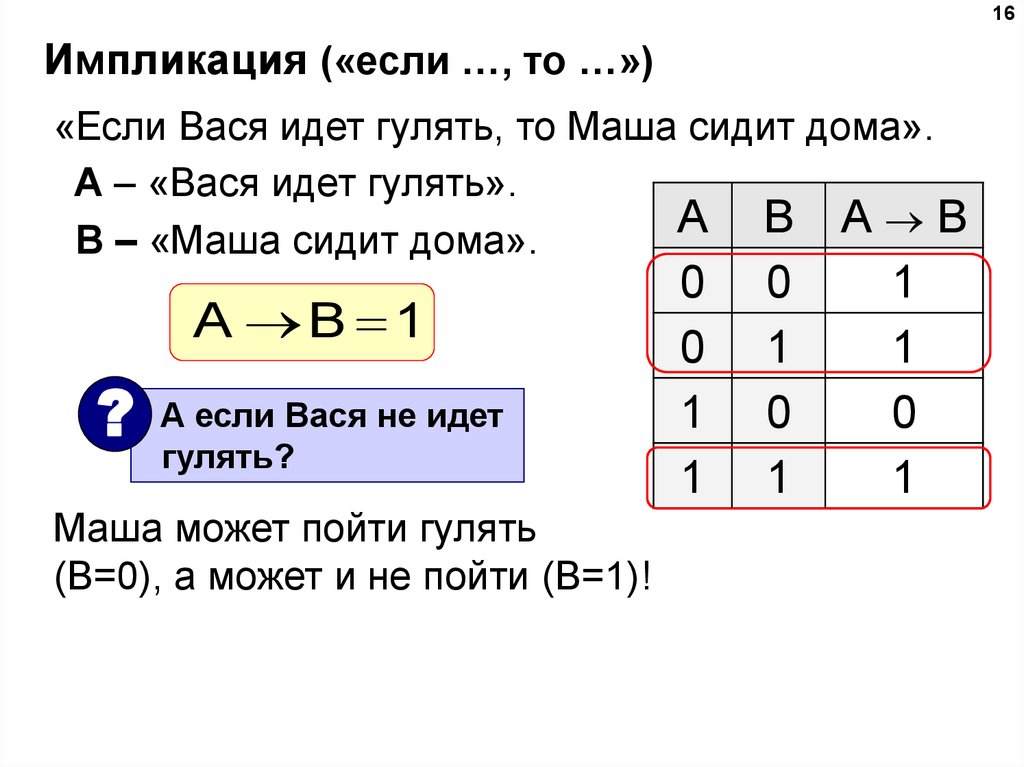 значения числа А (импликация из 0 в 1).