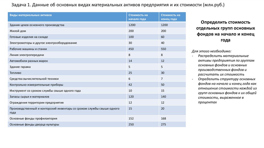 Задача 1. Данные об основных видах материальных активов предприятия и их стоимости (млн.руб.)Виды материальных активов