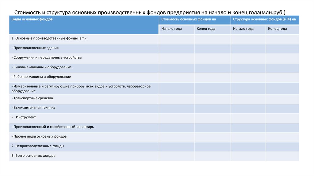 Стоимость и структура основных производственных фондов предприятия на начало и конец года(млн.руб.)Виды основных фондов