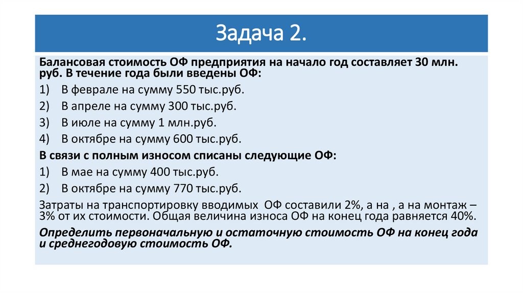 Задача 2.Балансовая стоимость ОФ предприятия на начало год составляет 30 млн.