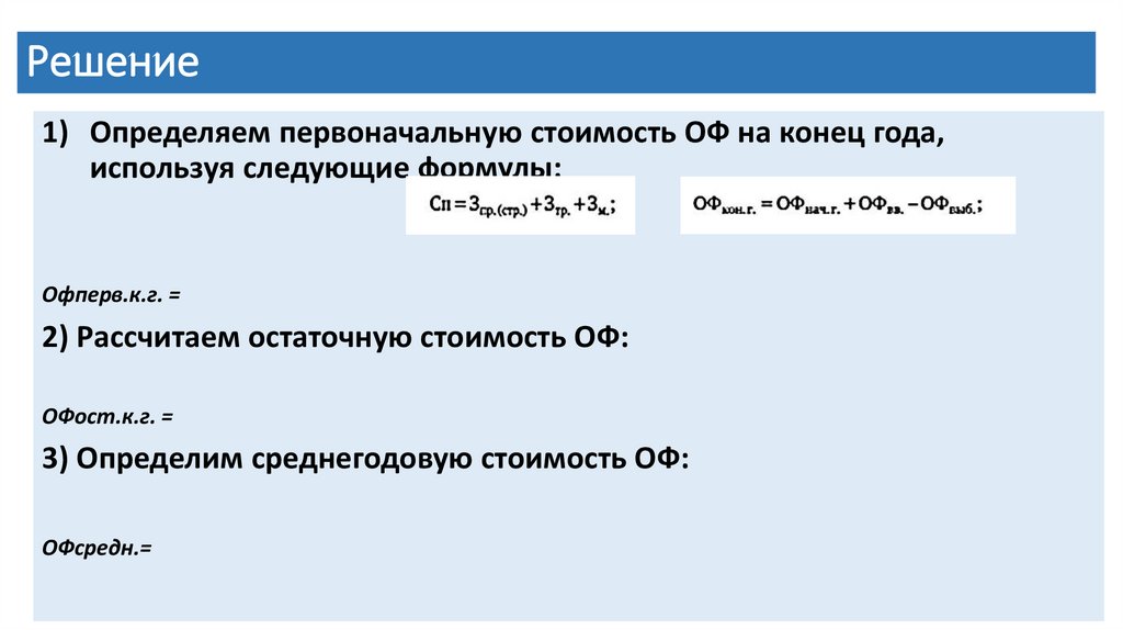 Решение1) Определяем первоначальную стоимость ОФ на конец года,
