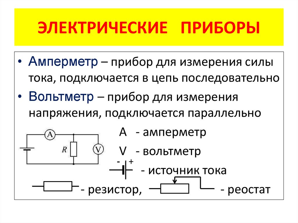 ЭЛЕКТРИЧЕСКИЕ ПРИБОРЫ• Амперметр – прибор для измерения силы