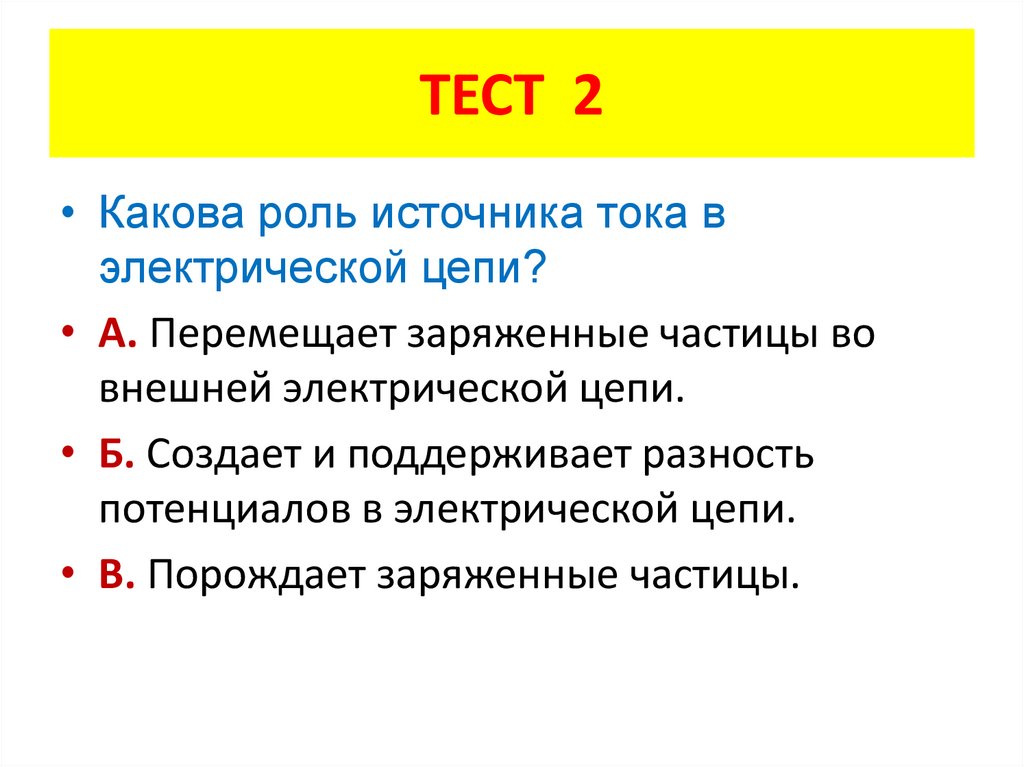 ТЕСТ 2• Какова роль источника тока в