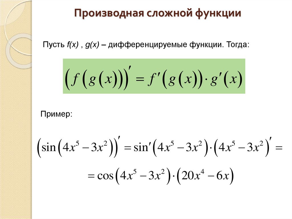 Производная сложной функцииПусть f(x) , g(x) – дифференцируемые функции. Тогда: