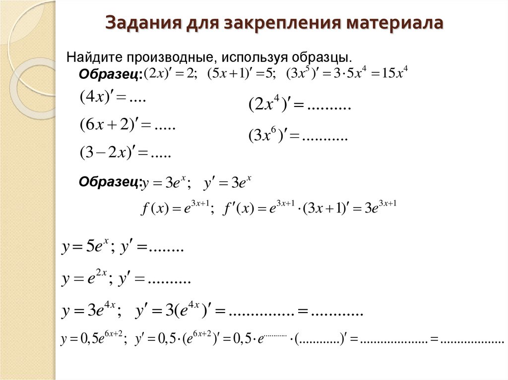 Задания для закрепления материалаНайдите производные, используя образцы.