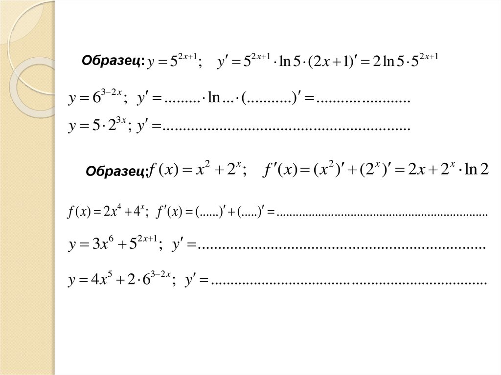 Образец: y 52 x 1;y 52 x 1 ln 5 (2 x 1) 2ln 5 52 x 1