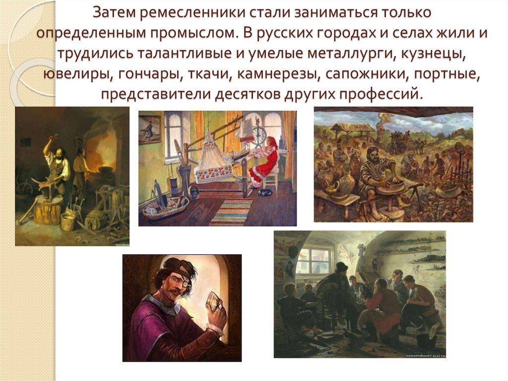 Затем ремесленники стали заниматься толькоопределенным промыслом. В русских городах и селах жили и
