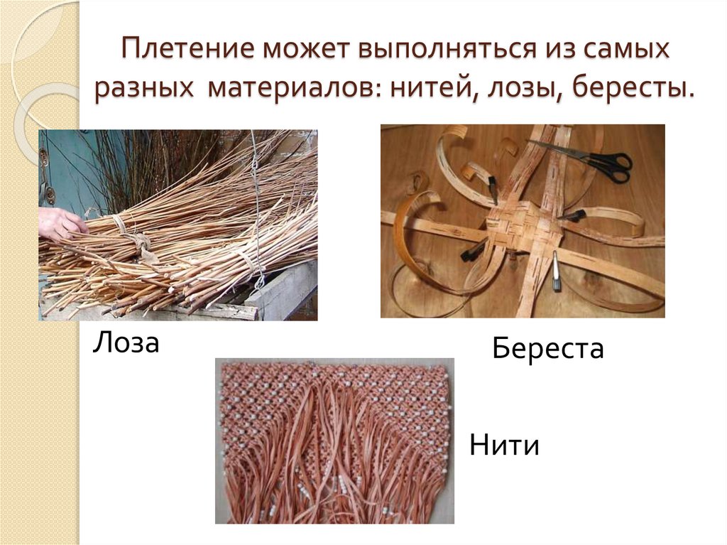 Плетение может выполняться из самыхразных материалов: нитей, лозы, бересты.