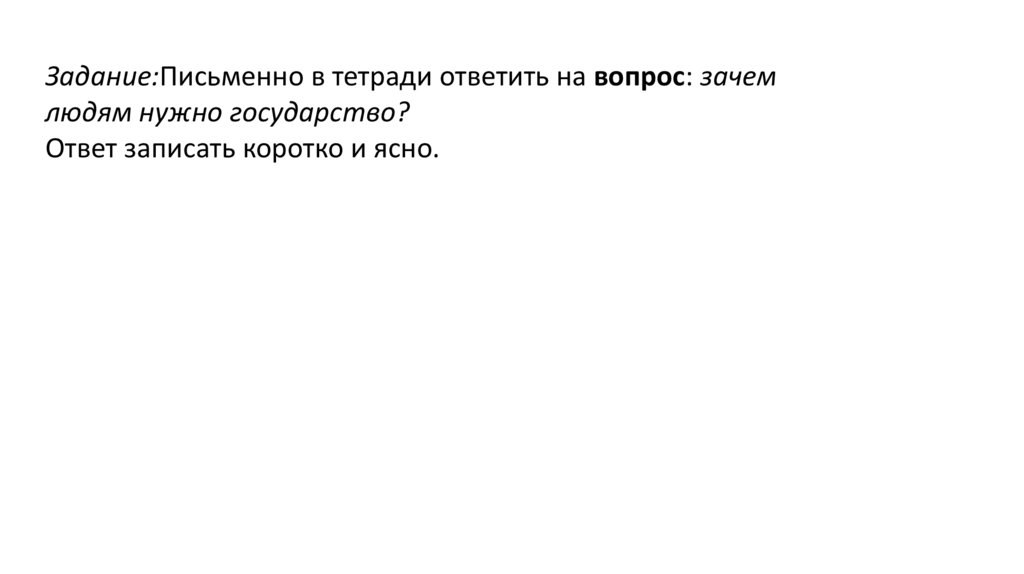 Задание:Письменно в тетради ответить на вопрос: зачемлюдям нужно государство?