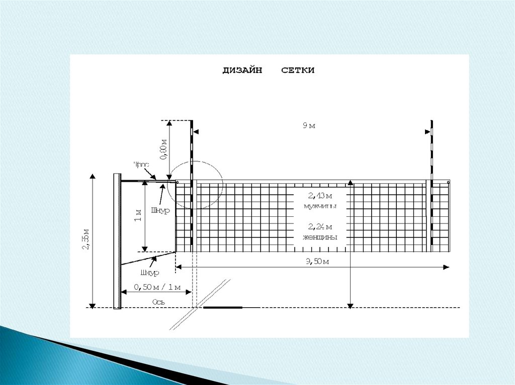 7. Игра ведётся на прямоугольной площадке размером 18х9 метров, которая разделена посередине сеткой.