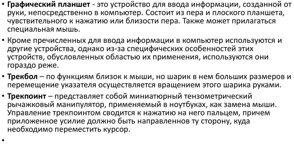 • графический планшет – позволяющий вводить в компьютер, как рисунки, так и текстовую информацию;
