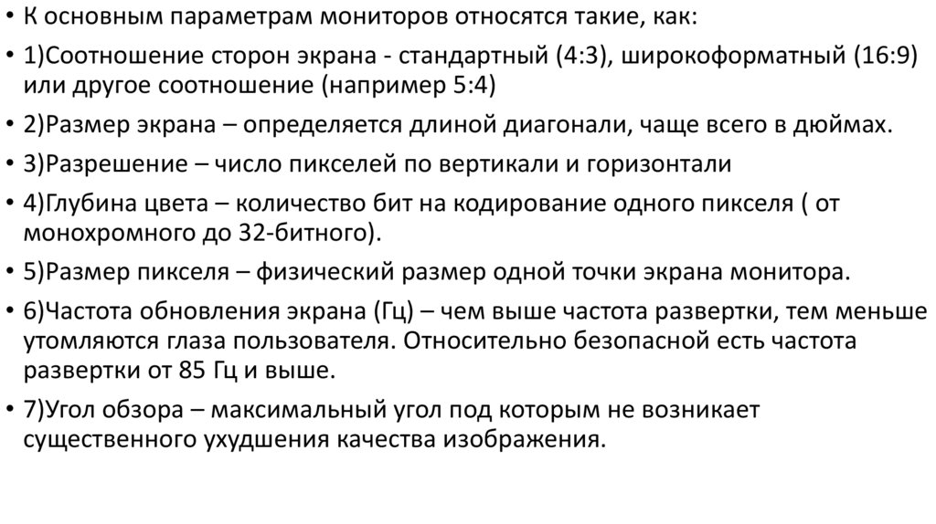 • К основным параметрам мониторов относятся такие, как:• 1)Соотношение сторон экрана - стандартный (4:3), широкоформатный (16:9)