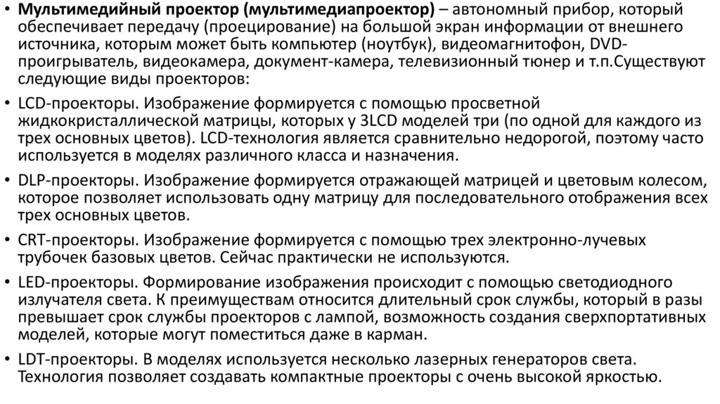 • Мультимедийный проектор (мультимедиапроектор) – автономный прибор, которыйобеспечивает передачу (проецирование) на большой экран информации от внешнего