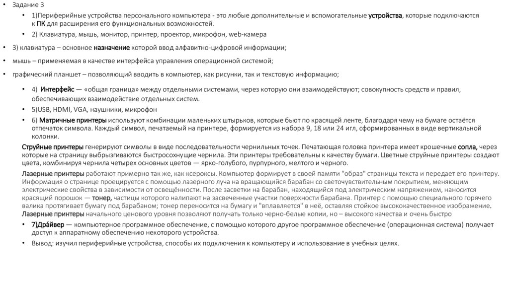 • Задание 3• 1)Периферийные устройства персонального компьютера - это любые дополнительные и вспомогательные устройства, которые подключаются